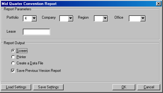 The user enters report parameters and selects output to screen, printer or datafile. |